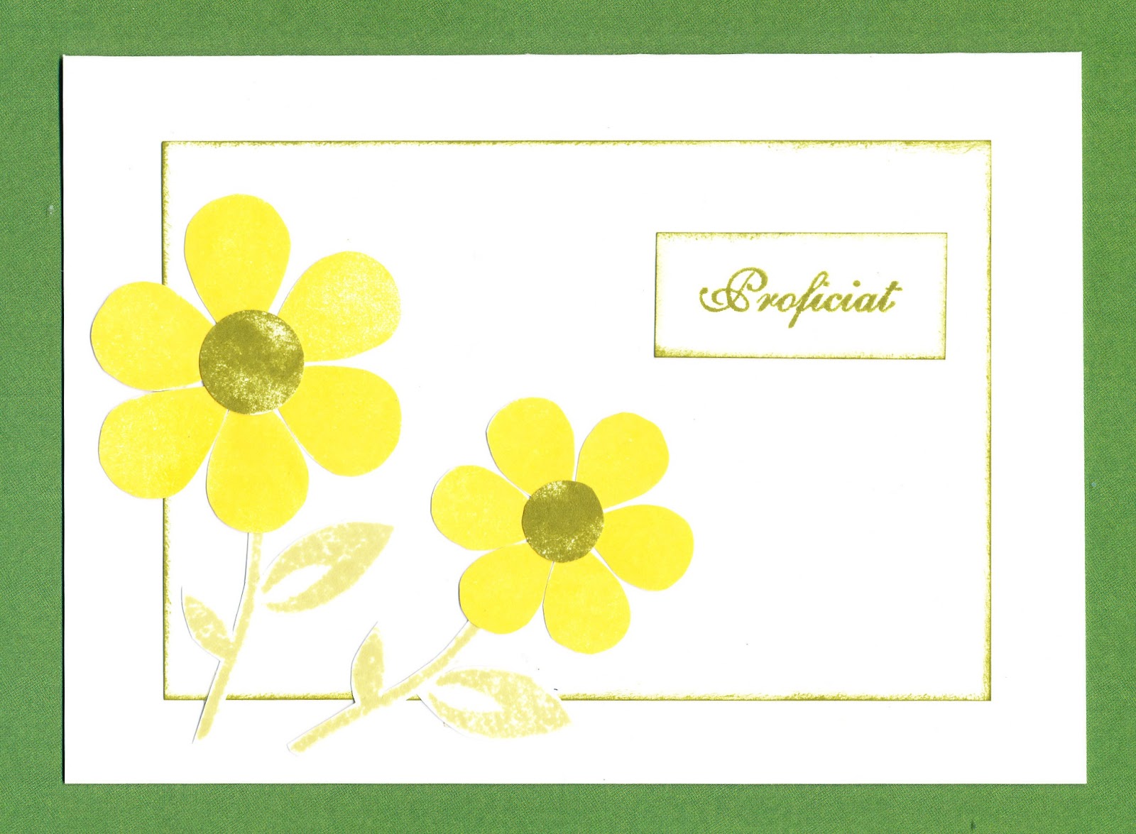 De uitgeknipte bloemen daar weer opgeplakt. Proficiat er op en mijn kaart is klaar. Ik had zoveel bloemenblaadjes gestempeld dat ik nog 2 kaarten kon maken. Voor de duidelijkheid: De basis kaart is wit, voor het contrast is het groen papier gebruikt.