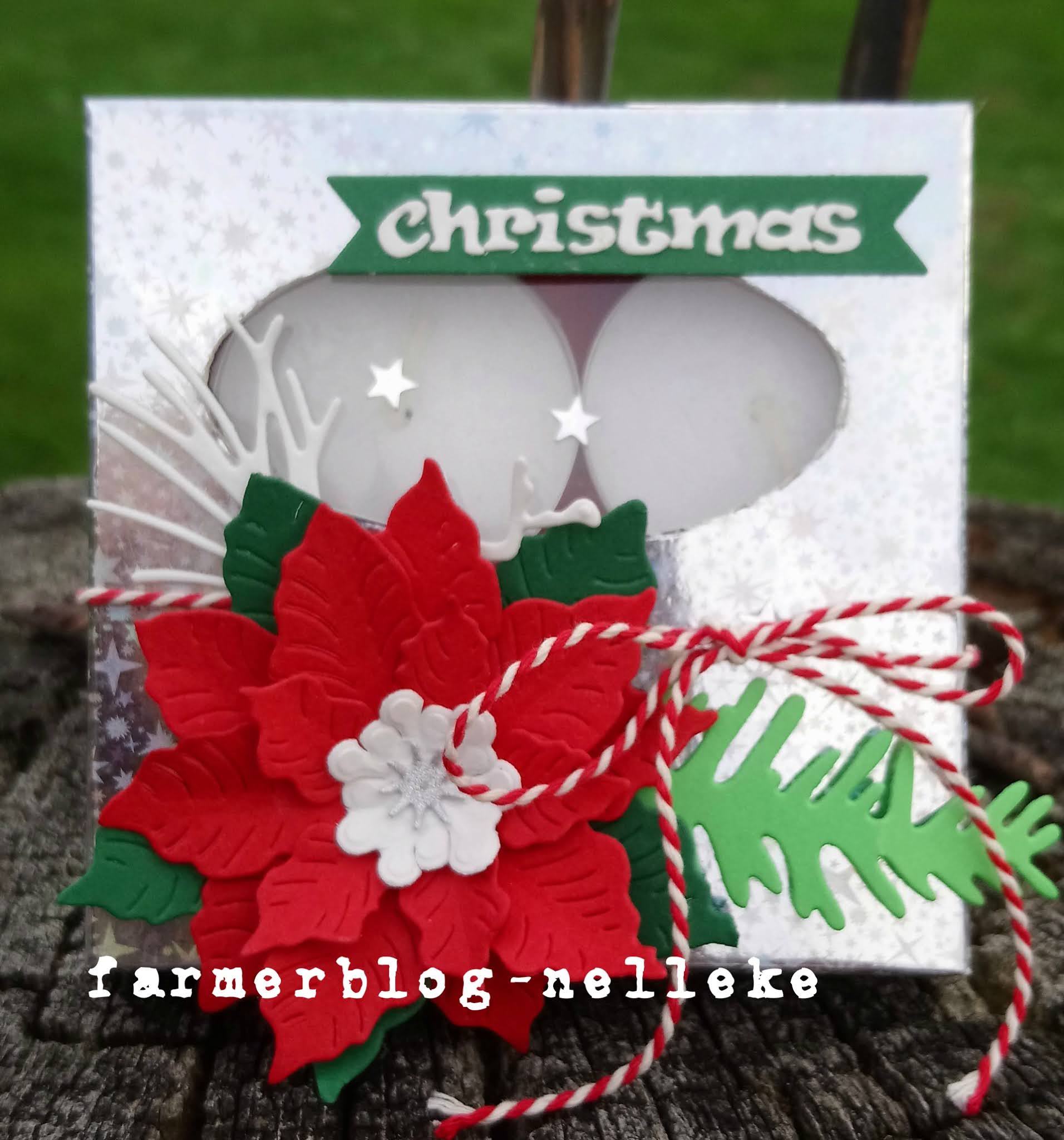 Dit doosje vond ik een tijd geleden. Ik heb er een ovalen venster in gemaakt en mijn poinsettia weer eens gebruikt. Een strikje, wat takjes en sterren en bovenaan een banner met Christmas en mijn doosje is klaar. Leuk om zo tussen door te maken. Er valt ook niet meer over te vertellen.